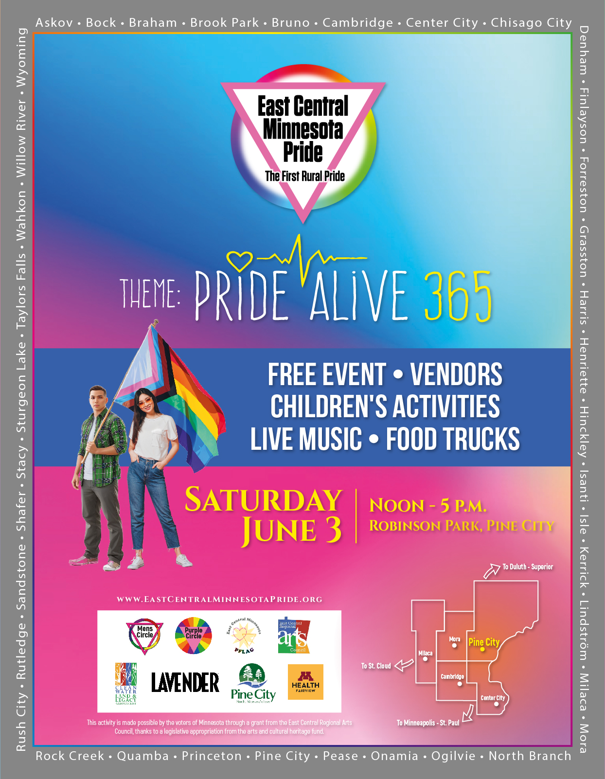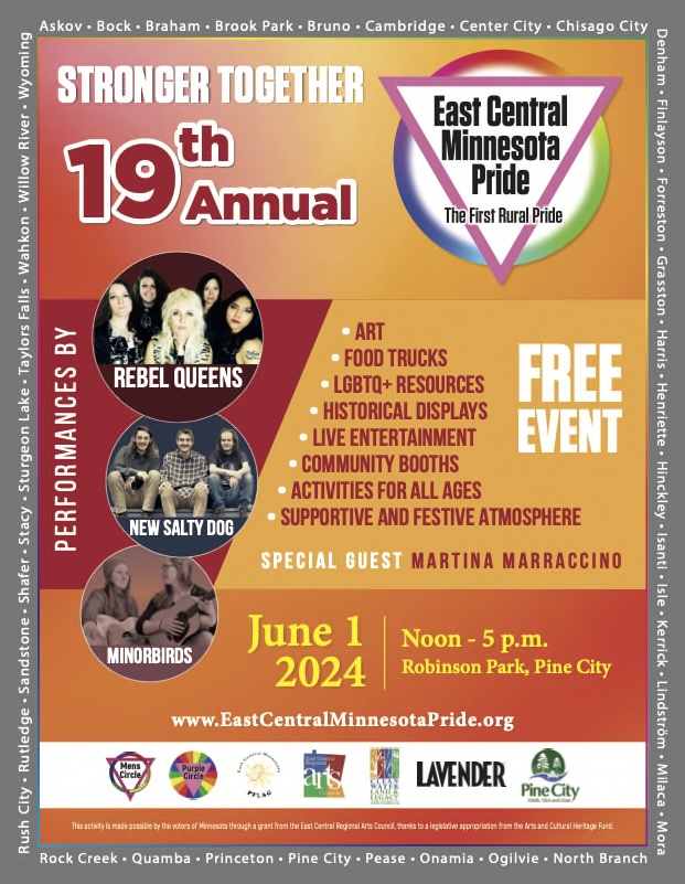 - “Minnesota’s Small-Town Gay Pride”, East Central Minnesota Pride, was awarded the Community Pride Showcase at the Minnesota State Fair.